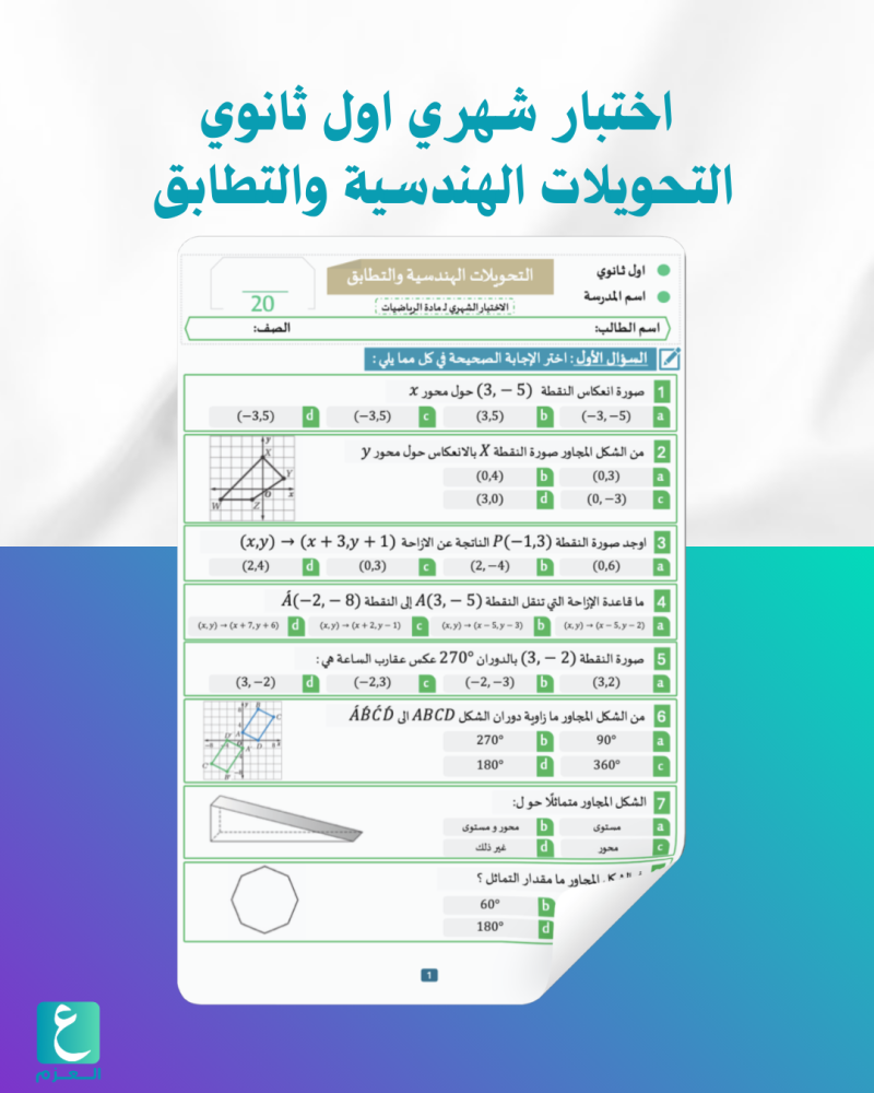اختبار شهري شامل ومصمم بعناية لتقويم مستوى طلاب الصف الأول الثانوي في الباب السابع من منهج الرياضيات